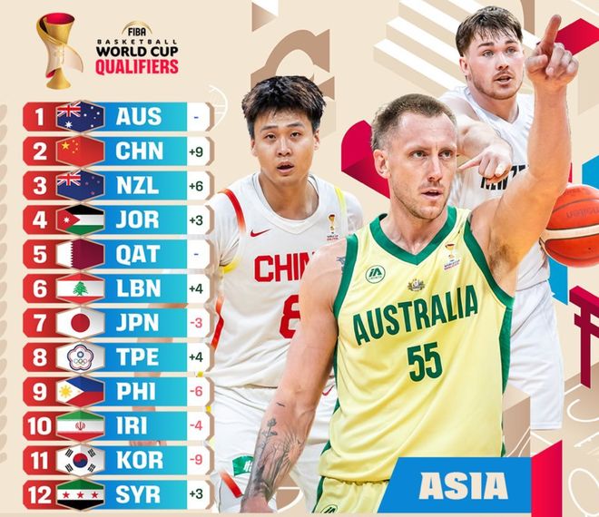 世预赛亚大区最新实力榜:中国男篮从11狂飙至第2 仅落后澳大利亚
